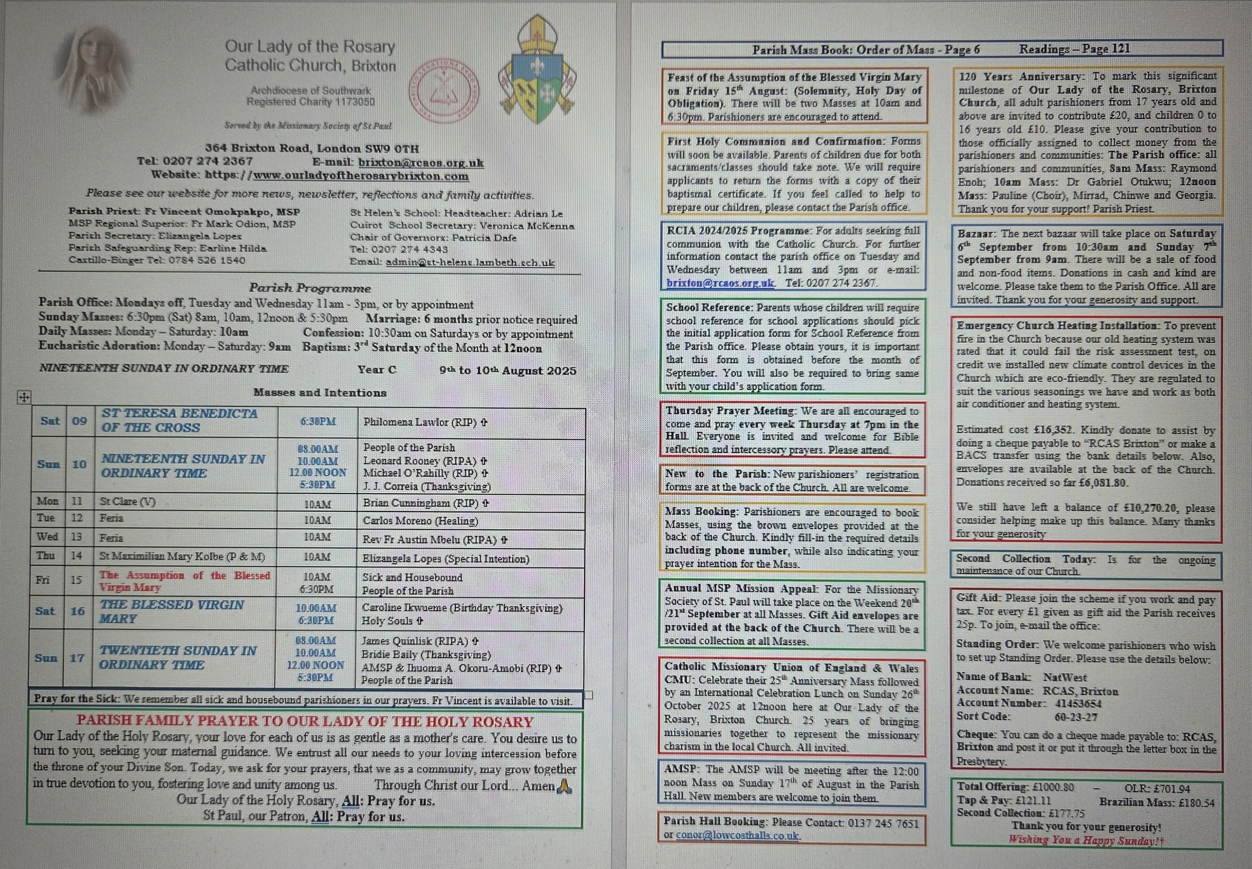 Nineteenth Sunday in Ordinary Time (Year C) 10th August 2025 August 7, 2025 Amanda Brefo CLICK TO VIEW NEWSLETTER Subscribe to our parish newsletter to receive news and updates straight to your inbox! Subscribe